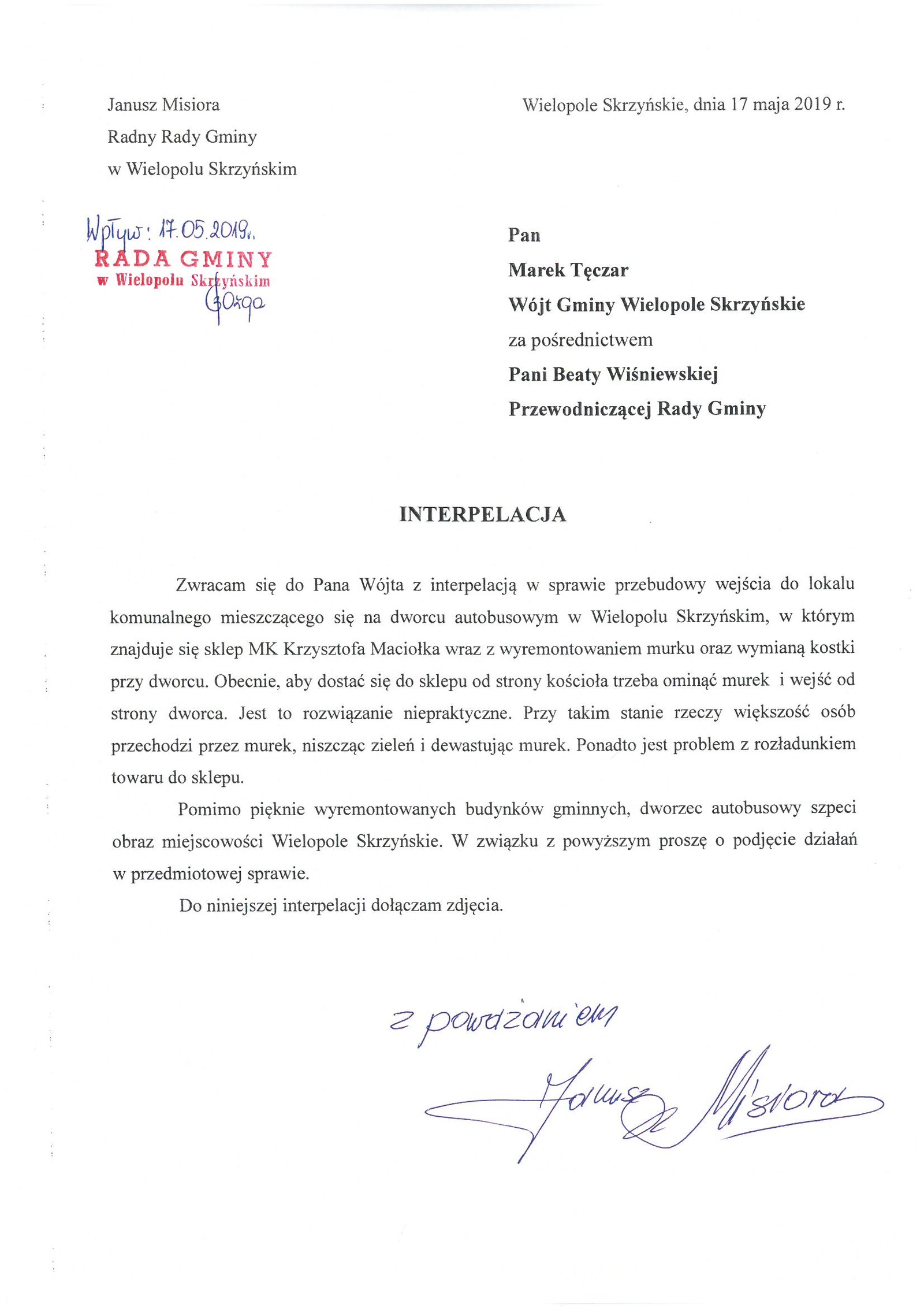 Poniedziałek 27 maja 2019 Interpelacja radnego Strona Główna/Informator/InformacjeDokumenty do pobraniaDokumenty do pobrania#Nazwa DokumentuTREŚĆ INTERPELACJI POBIERZODPOWIEDŹ POBIERZ