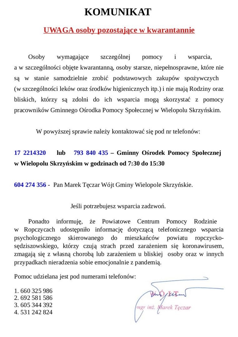 Wtorek 17 marca 2020 Komunikat dla osób przebywajacych w kwarantannie Strona Główna/Informator/Ogłoszenia
