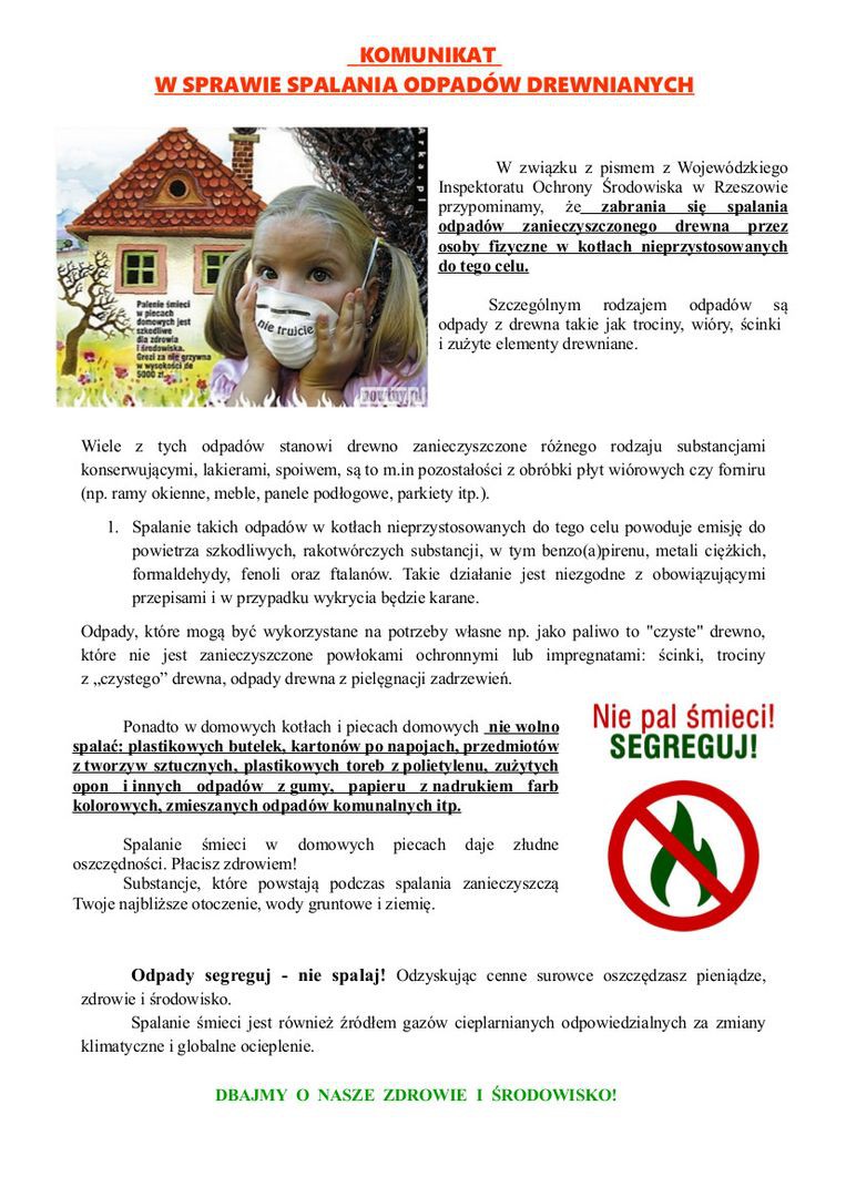 W związku z pismem z Wojewódzkiego Inspektoratu Ochrony Środowiska w Rzeszowie przypominamy, że zabrania się spalania odpadów zanieczyszczonego drewna przez osoby fizyczne w kotłach nieprzystosowanych do tego celu. Szczególnym rodzajem odpadów są odpady z drewna takie jak trociny, wióry, ścinki i zużyte elementy drewniane.