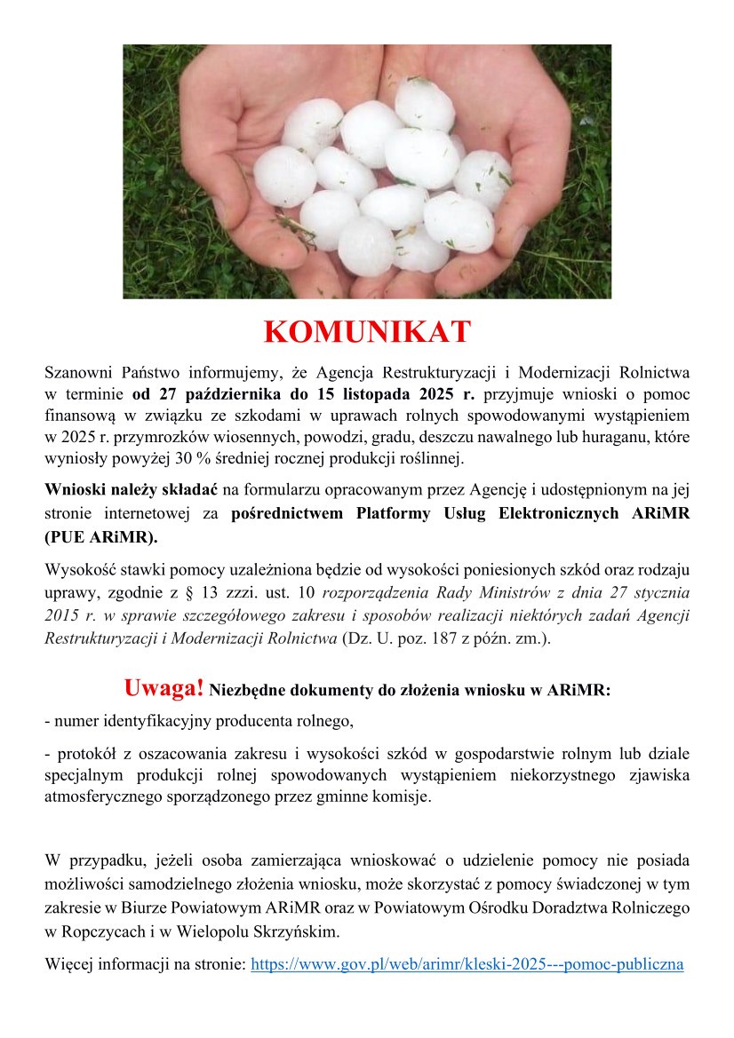 Poniedziałek 27 października 2025 Komunikat Strona Główna/AktualnościWięcej informacji na stronie: https://www.gov.pl/web/arimr/kleski-2025---pomoc-publiczna