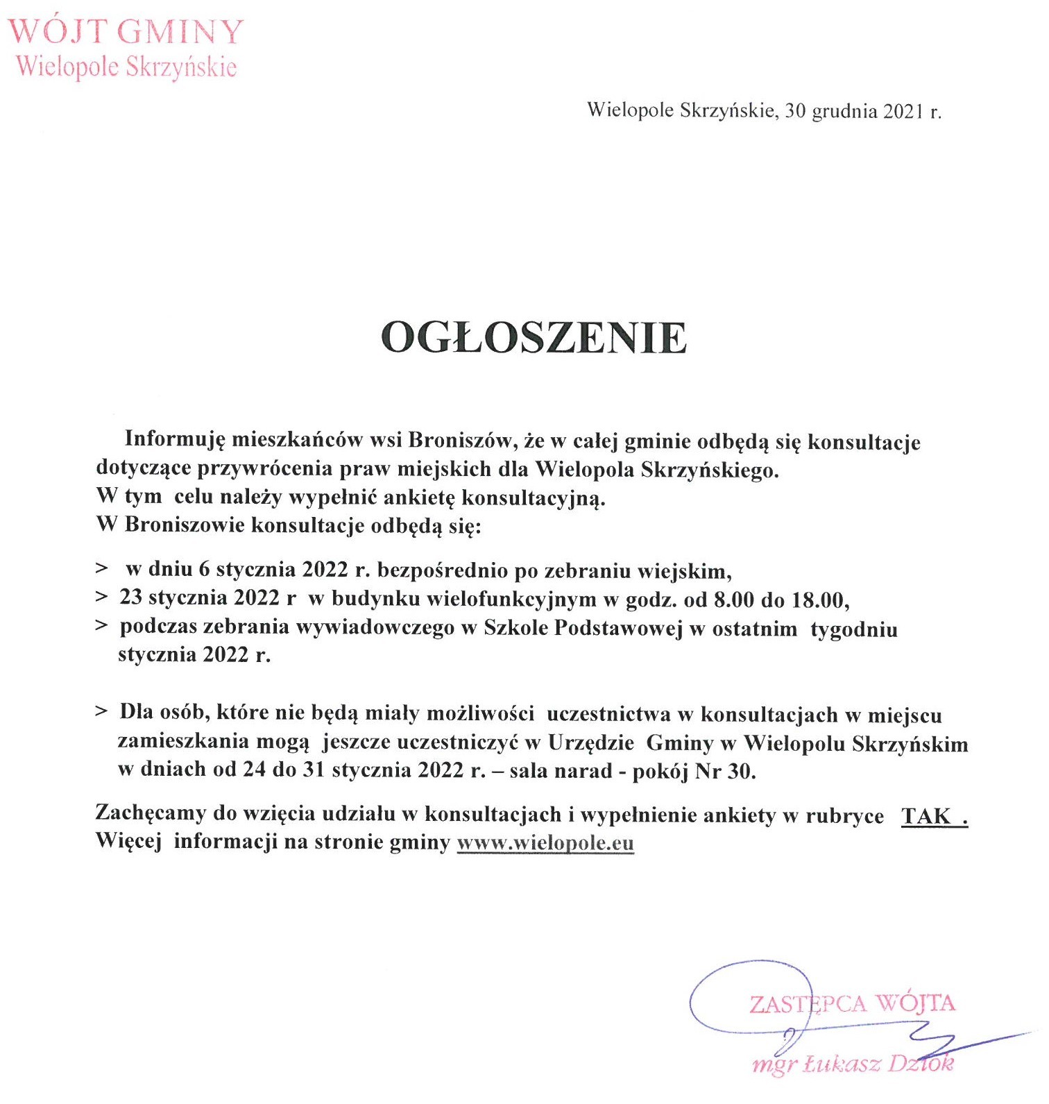 Wtorek 4 stycznia 2022 Konsultacje w Broniszowie dotyczące przywrócenia praw miejskich dla Wielopola Skrzyńskiego Strona Główna/Informator/Ogłoszenia/Konsultacje społeczne