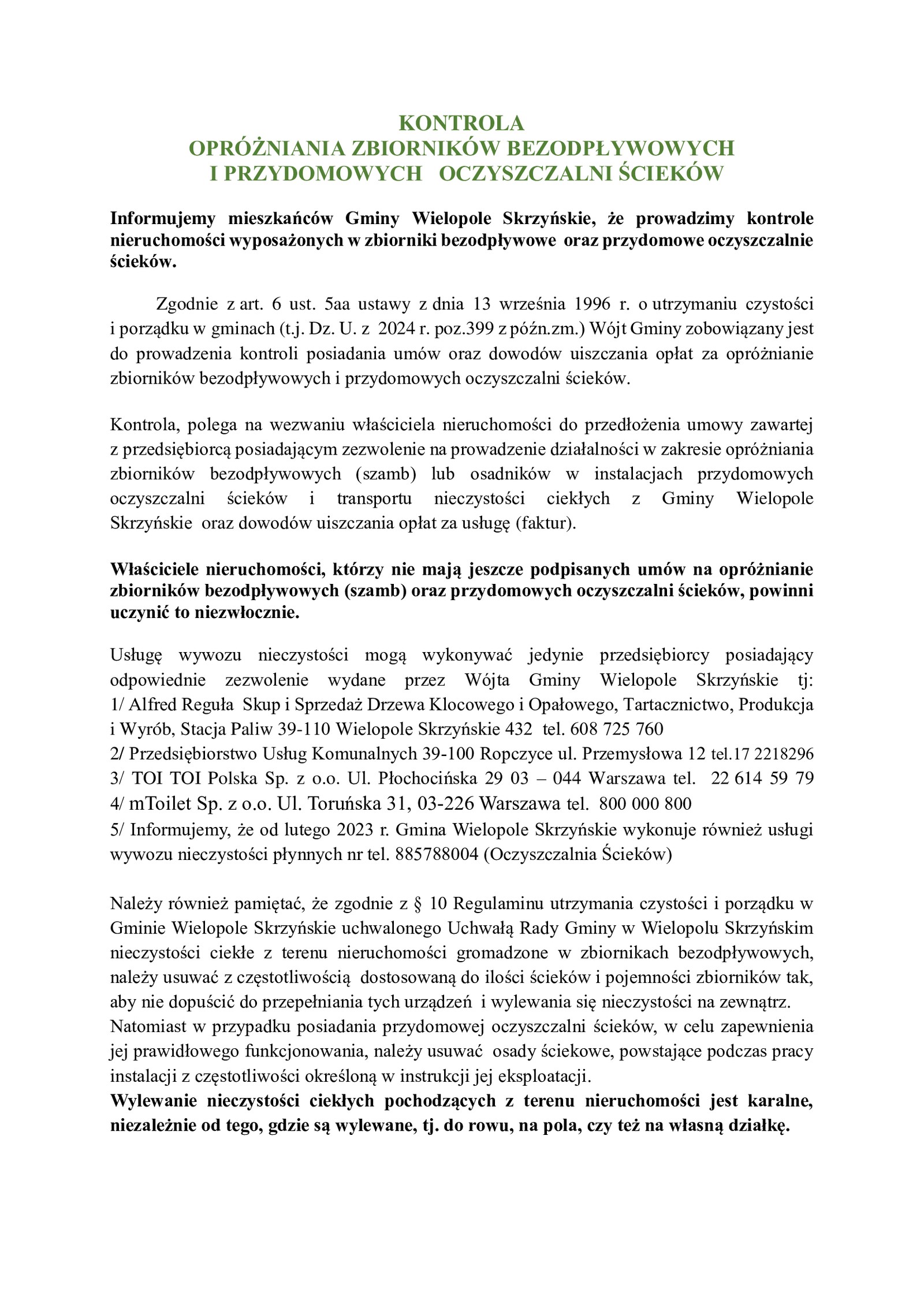 Środa 9 lipca 2025 KONTROLA OPRÓŻNIANIA ZBIORNIKÓW BEZODPŁYWOWYCH I PRZYDOMOWYCH OCZYSZCZALNI ŚCIEKÓW Strona Główna/Biuletyn Informacji Publicznej/Gospodarka Komunalna