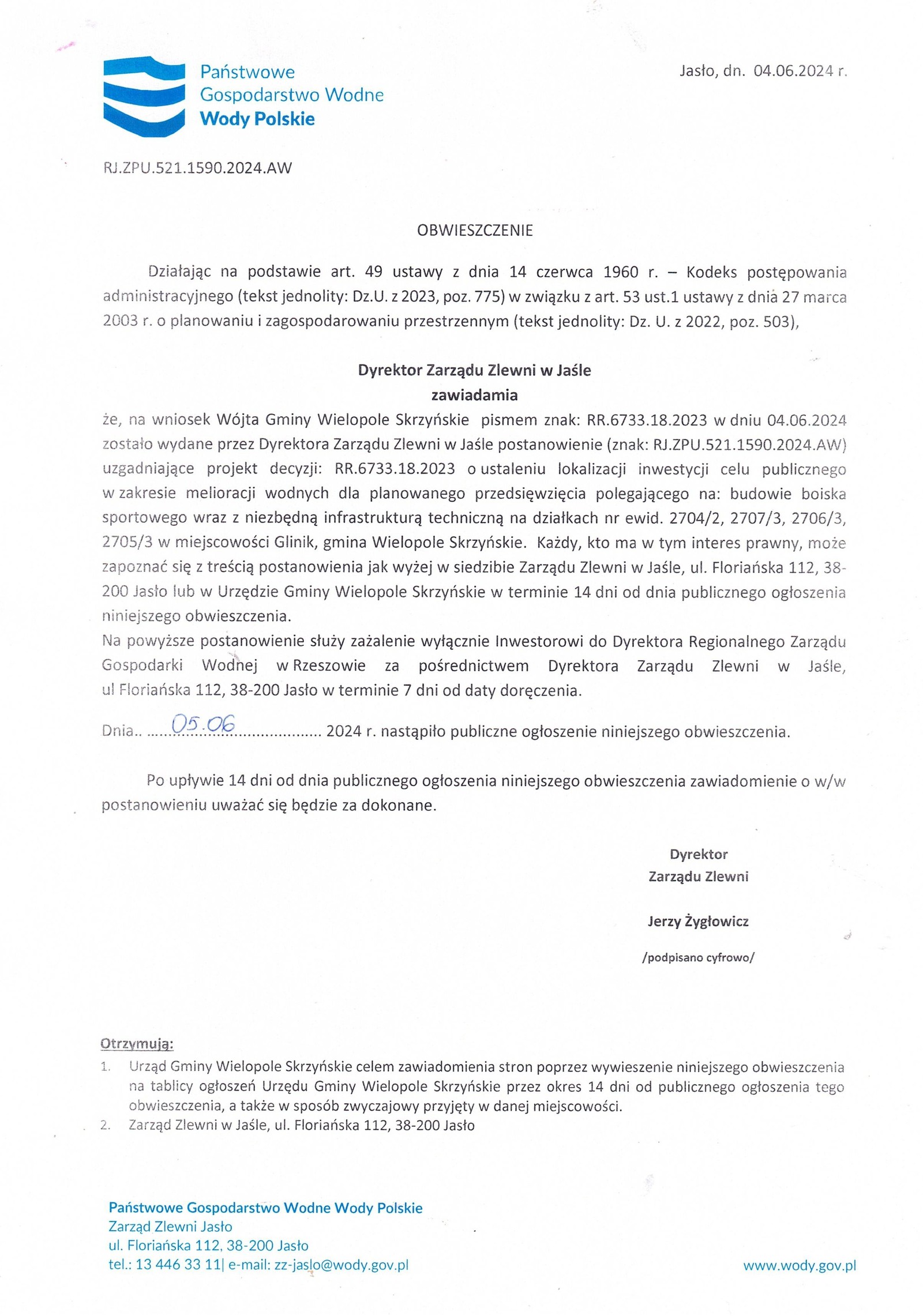 Środa 5 czerwca 2024 Obwieszczenie Dyrektora Zarządu Zlewni w Jaśle Strona Główna/Informator/Ogłoszenia
