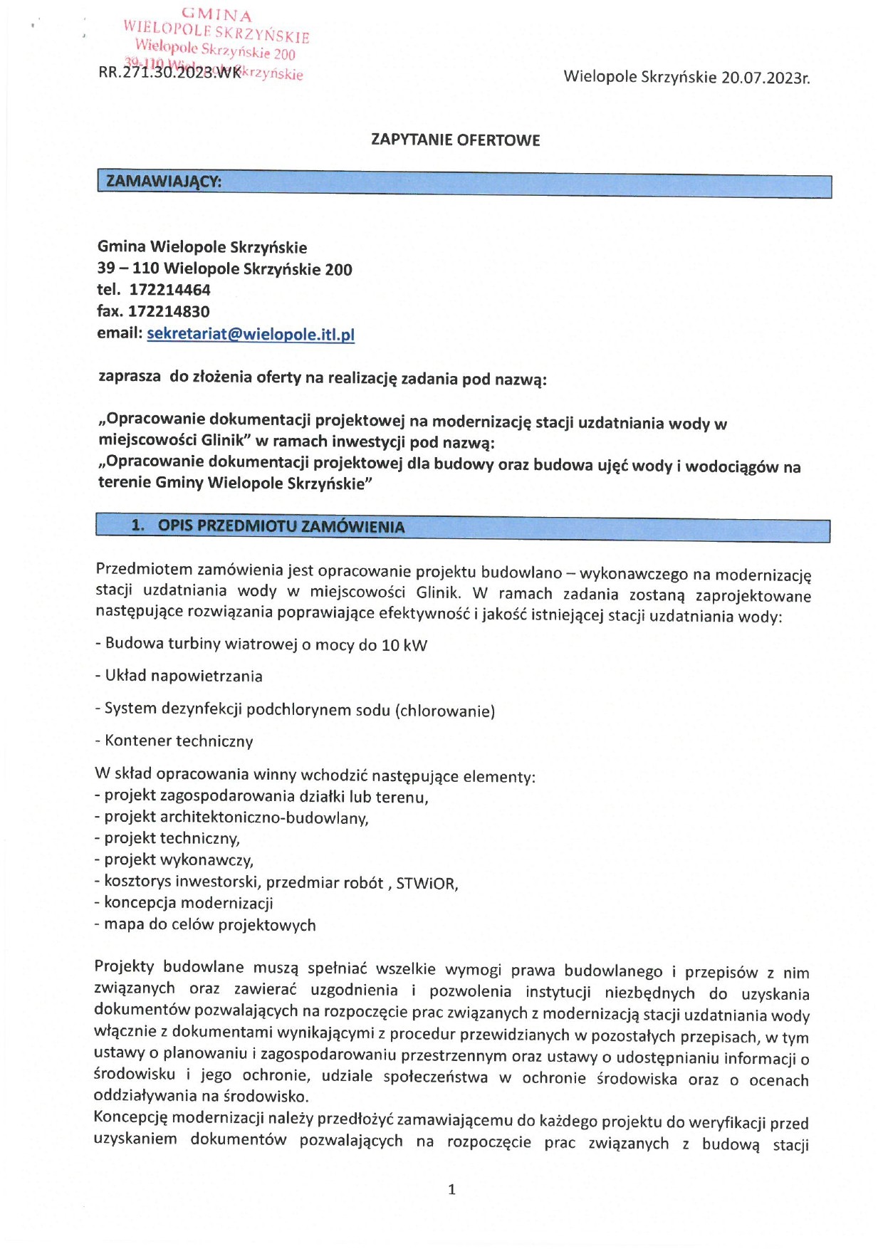 Zapytanie ofertowe: „Opracowanie dokumentacji projektowej na modernizację stacji uzdatniania wody w miejscowości Glinik" w ramach inwestycji pod nazwą: „Opracowanie dokumentacji projektowej dla budowy oraz budowa ujęć wody i wodociągów na terenie Gminy Wielopole Skrzyńskie"
