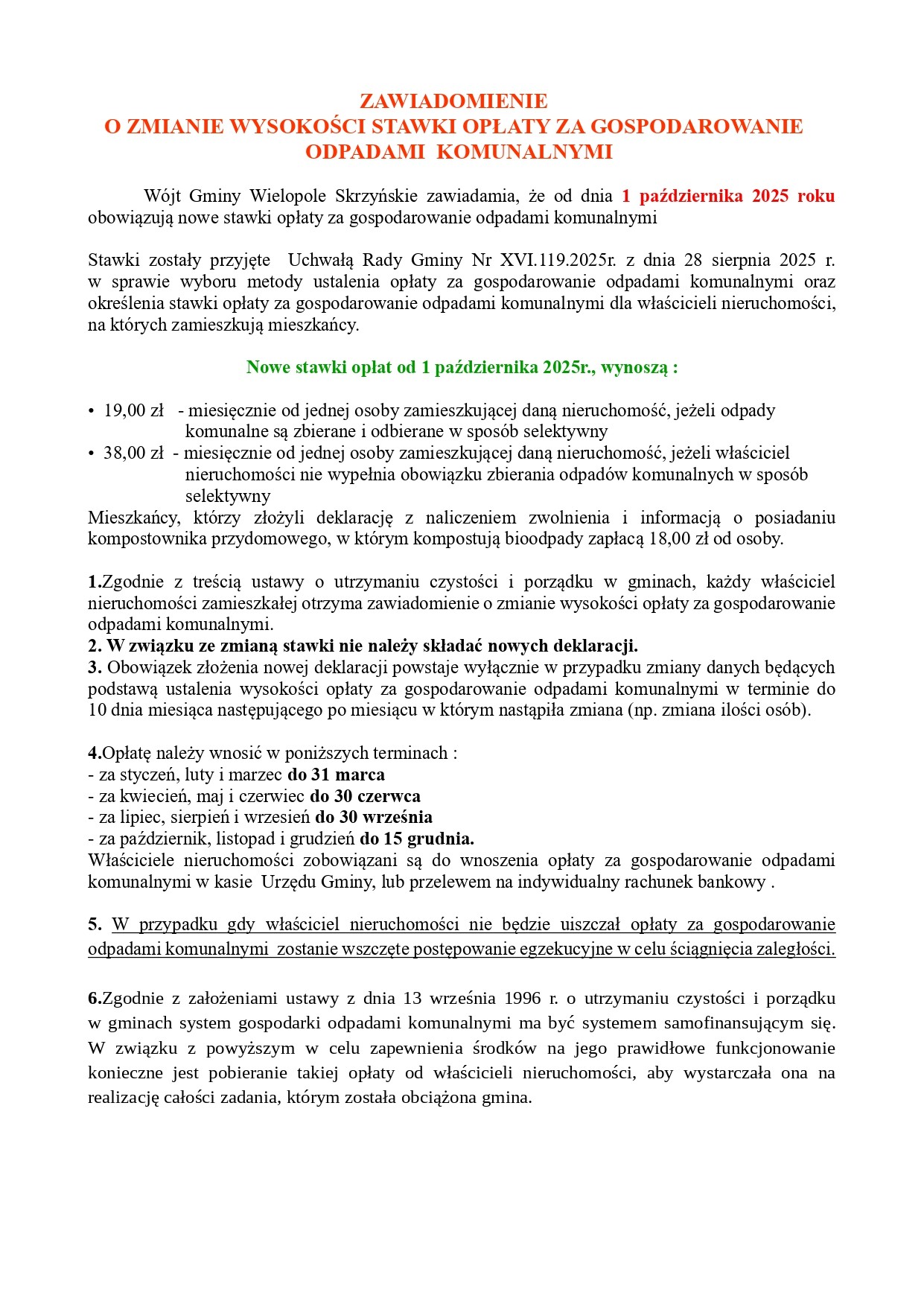 Czwartek 25 września 2025 ZAWIADOMIENIE O ZMIANIE WYSOKOŚCI STAWKI OPŁATY ZA GOSPODAROWANIE ODPADAMI KOMUNALNYMI Strona Główna/Biuletyn Informacji Publicznej/Gospodarka Komunalna