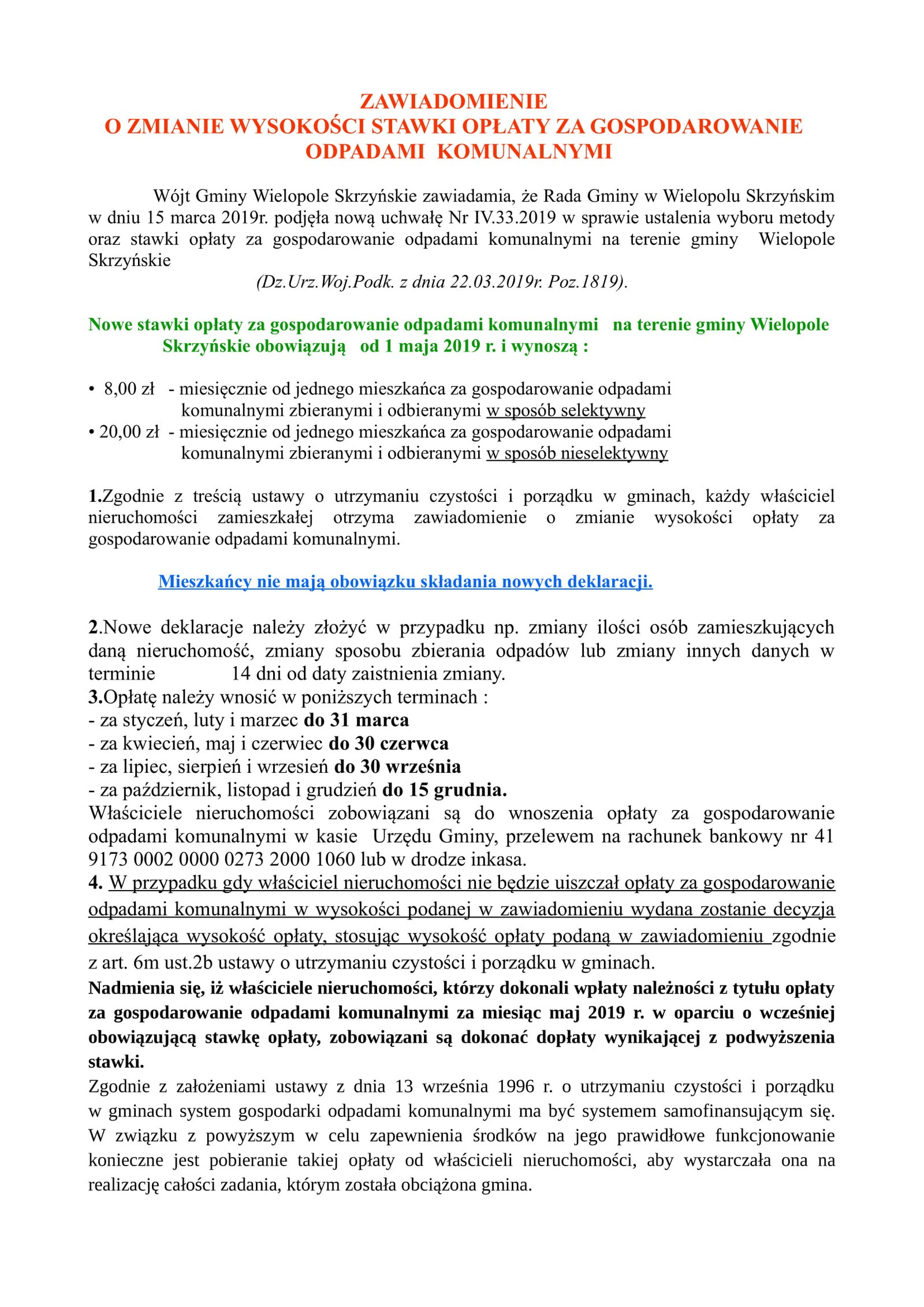 Wójt Gminy Wielopole Skrzyńskie zawiadamia, że Rada Gminy w Wielopolu Skrzyńskim w dniu 15 marca 2019r. podjęła nową uchwałę Nr IV.33.2019 w sprawie ustalenia wyboru metody oraz stawki opłaty za gospodarowanie odpadami komunalnymi na terenie gminy Wielopole Skrzyńskie.