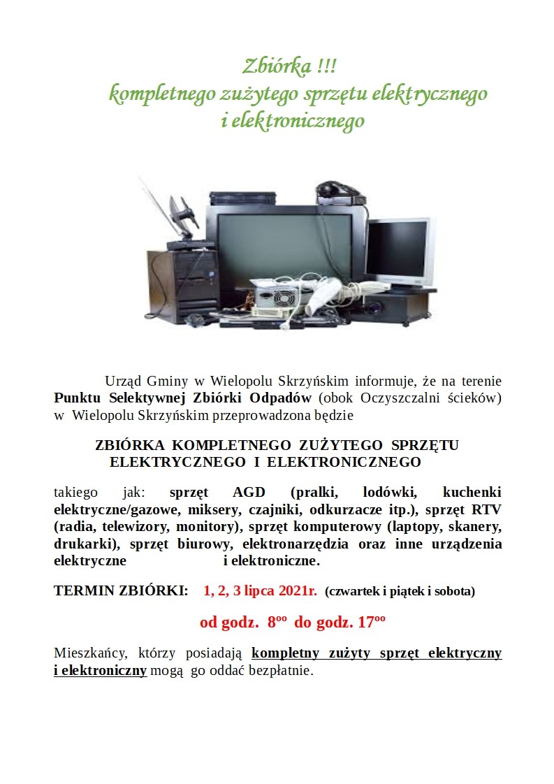 Piątek 25 czerwca 2021 Zbiórka kompletnego zużytego sprzętu elektrycznego i elektronicznego Strona Główna/Biuletyn Informacji Publicznej/Gospodarka Komunalna