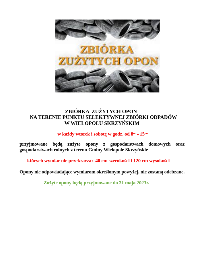 Czwartek 9 marca 2023 Zbiórka zużytych opon Strona Główna/Informator/OgłoszeniaZBIÓRKA ZUŻYTYCH OPON NA TERENIE PUNKTU SELEKTYWNEJ ZBIÓRKI ODPADÓW W WIELOPOLU SKRZYŃSKIM
